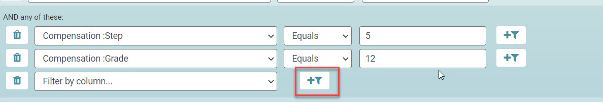 When creating a filter group, click the add filter icon, as seen below, to add more options to your group.