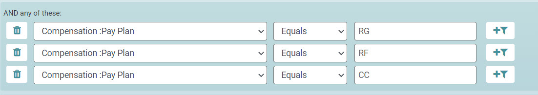 The results in the data grid will yield any employee that has any one of those three pay plans. In other words, any employee that is either an RG or RF or CC. This is a more inclusive search parameter.