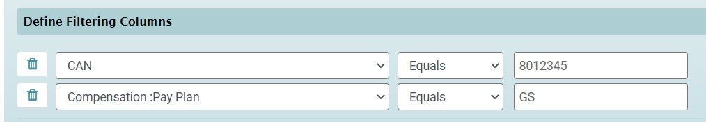 The results in the data grid will yield only those employees who are GS employees AND in CAN 8012345.