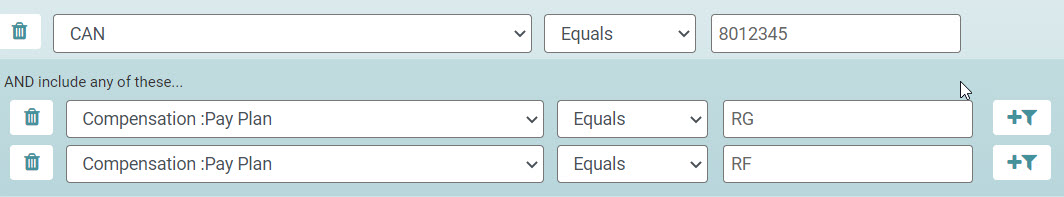 The results in the data grid will be of employees in CAN 8012345 who are either in pay plan RG or RF.