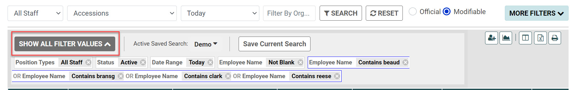 After you search the applied filters will show below the Show All Filter Values button with an X to the right of the filter. To remove a filter click on the X. The Show All Filter Values button can be open and closed to show or hide the filter results. To restart your search from scratch click the Reset button.