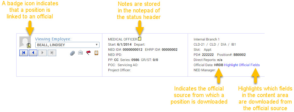 The Status Header provides the employee name and basic positional information, so users can always know whose record is currently in view. Users can also click on the  icon to easily access or edit any notes about the position.