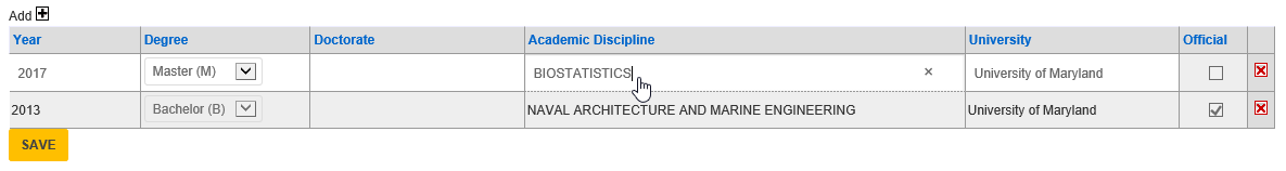 In the University field, enter the name of the University from where the degree was obtained. Users cannot fill out whether or not the degree is official, because the information must be recognized by HRDB. Official degrees cannot be edited, but unofficial degrees can be modified and/or deleted.