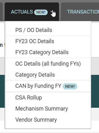 - The Actuals tab contains a variety of reports.