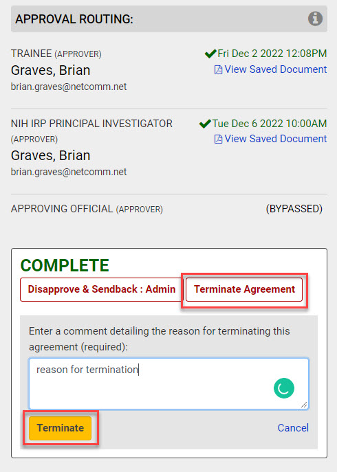 The Agreement will be marked as a terminated status from the Flow Dashboard page and on the Telework reports
