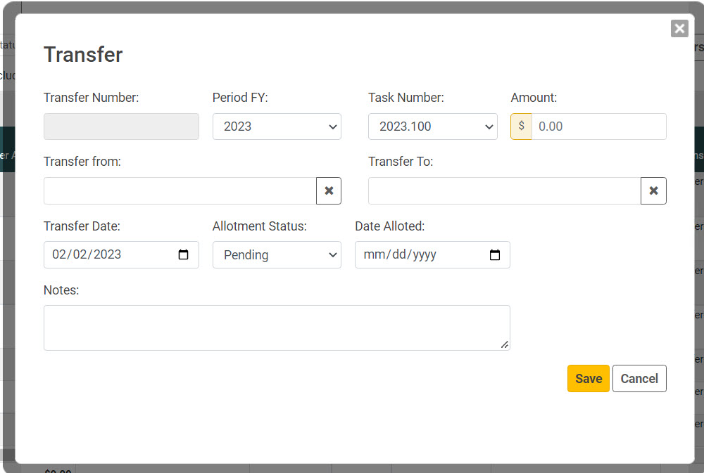 - From the pop-up modal, enter the account that is sending the funds in the Transfer From box and the account that is receiving the funds in the Transfer To box. The Period FY represents the year that the year the funds are being transferred in, and the Task number represents the year that the funds are transferring from. If the funds are available to spend, mark the allotment status as allotted.