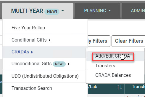 - Under the Multi-Year Tab, click CRADA and Add/Edit CRADA Fund.