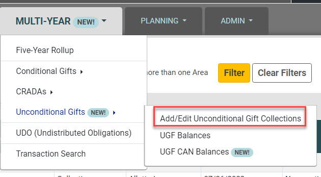 - Under the Multi-Year Tab, click Unconditional Gifts and Add/Edit Unconditional Gift Fund.