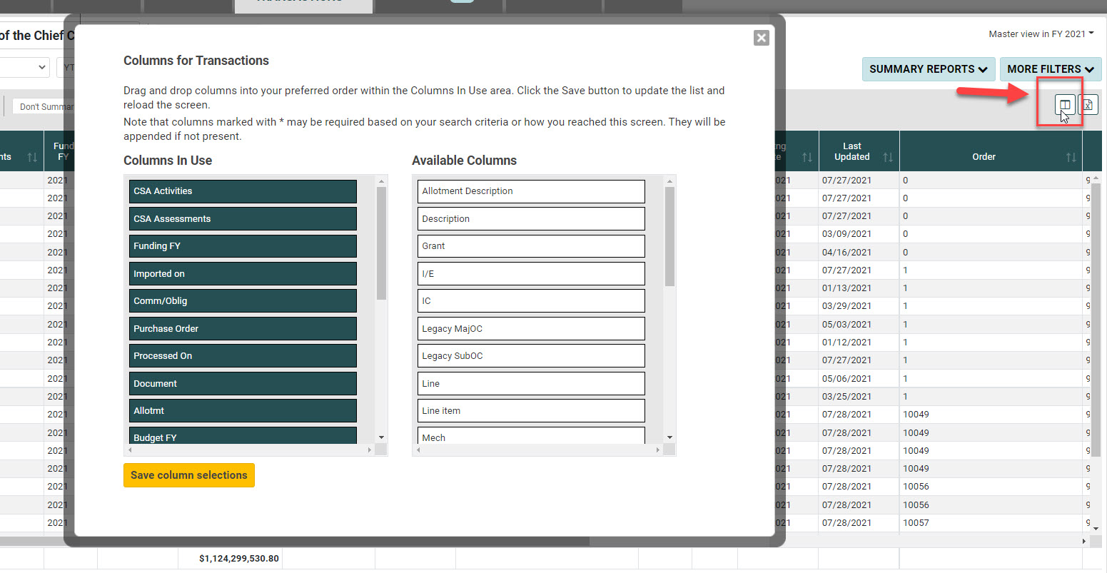There are dozens of facts about a single transaction. The Transactions screen allows you to customize what information you see about each transaction, from the document number or order number to the vendor, processing dates, or description. You can customize the data on the screen by using the Customize Column Preferences icon (highlighted below). The modal allows you to drag and drop columns to add/remove/reorder the columns in the transaction list. Changes made here will only impact your view. The first five columns will remain fixed as you scroll.