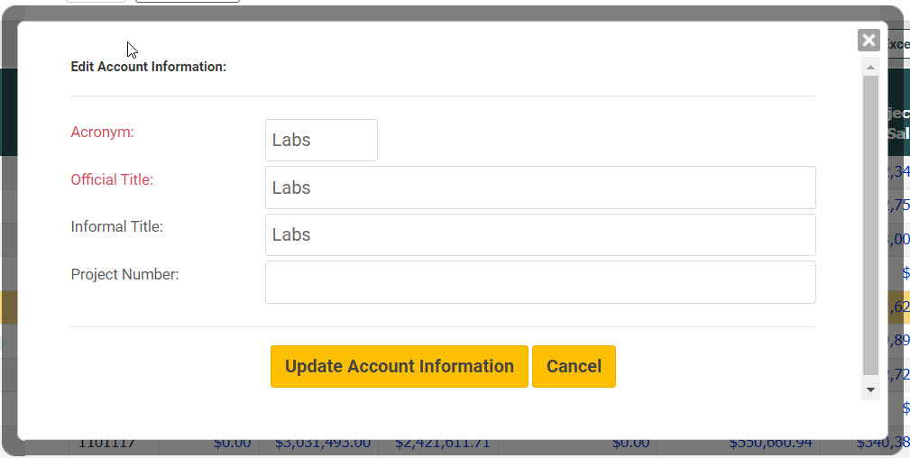In the pop-up modal update any of the provided fields (acronym / official title / informal title) and click the Update Account Information button.